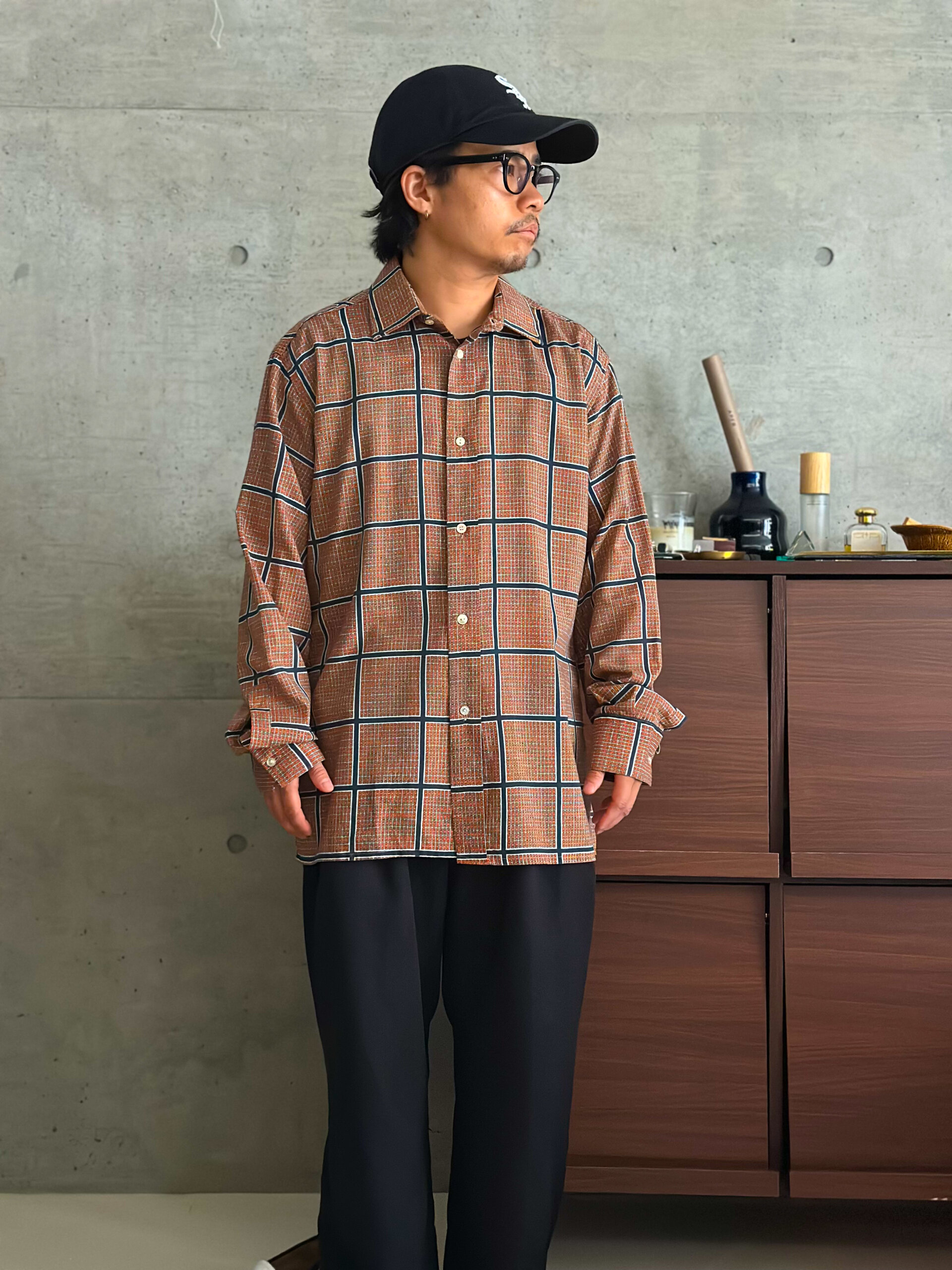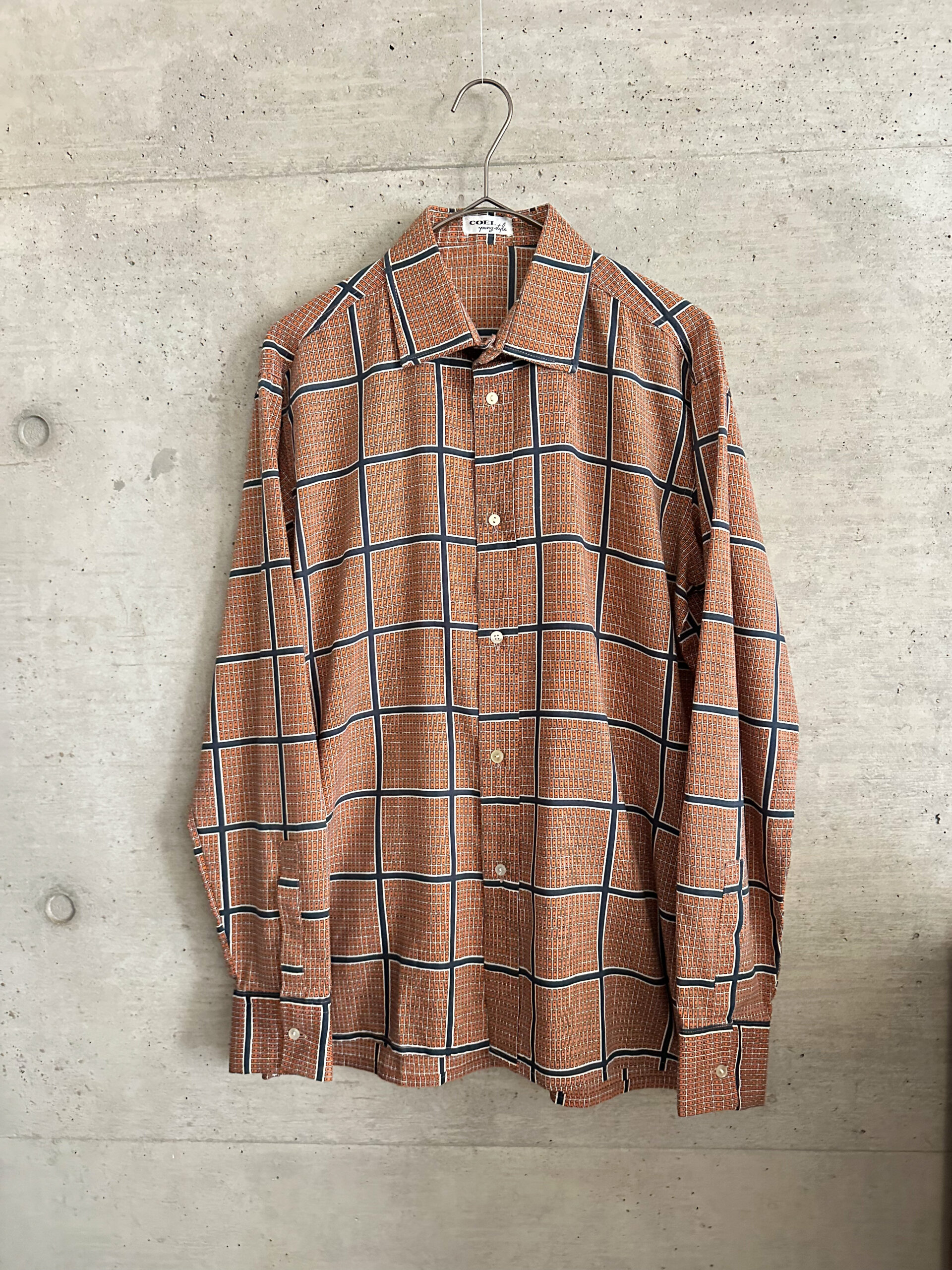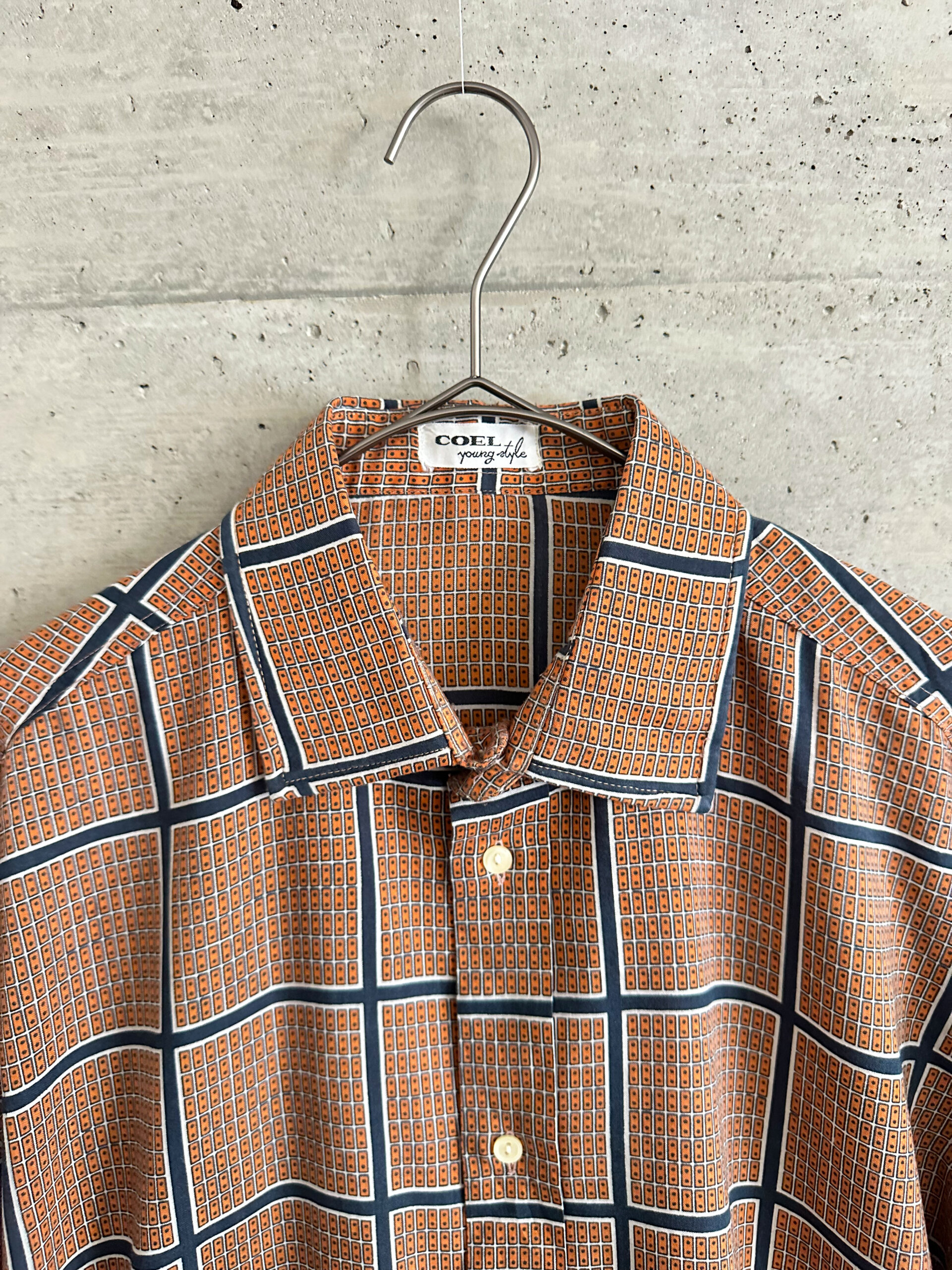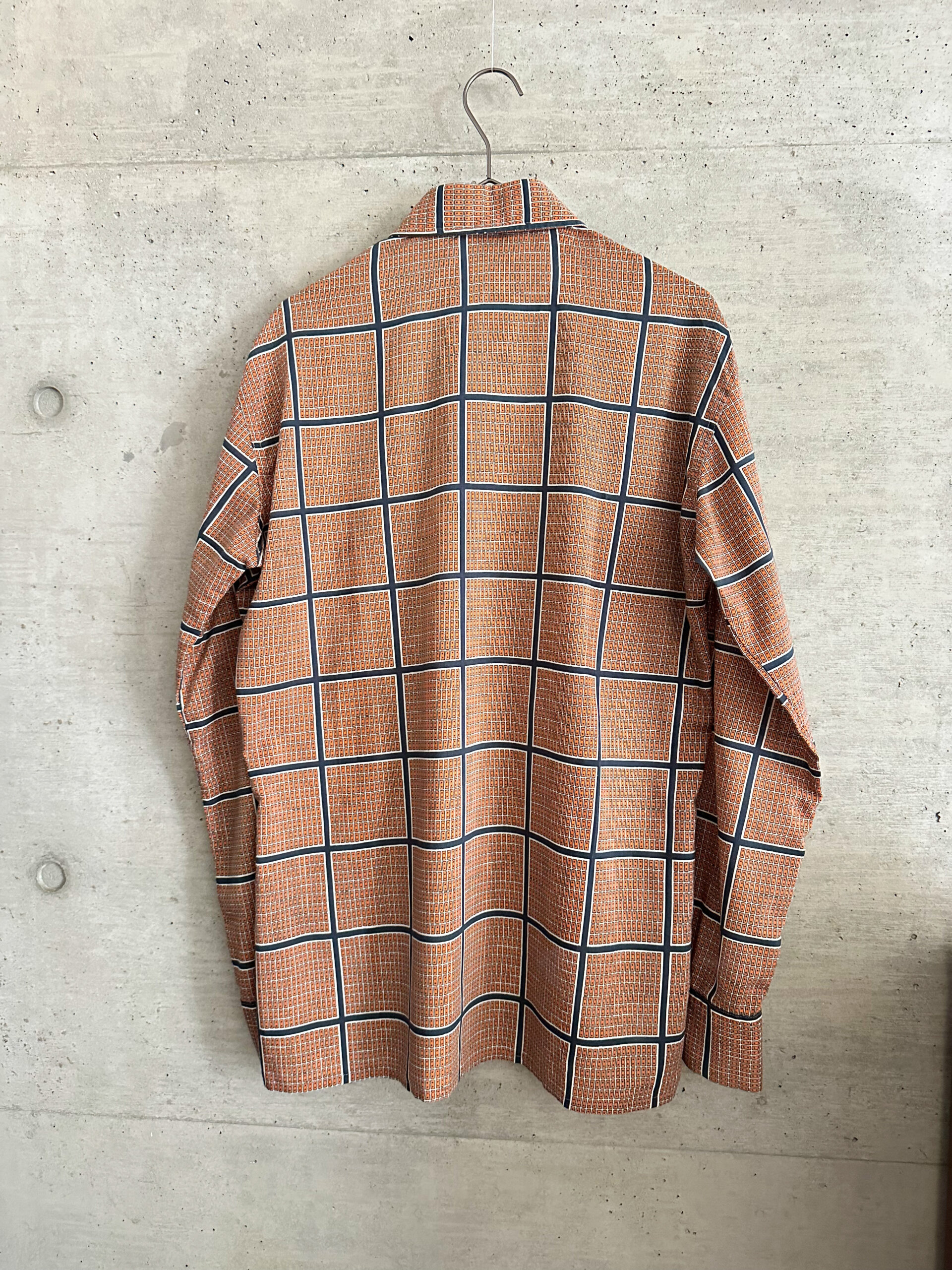オレンジ色の細かい柄が入った上品なシャツ。