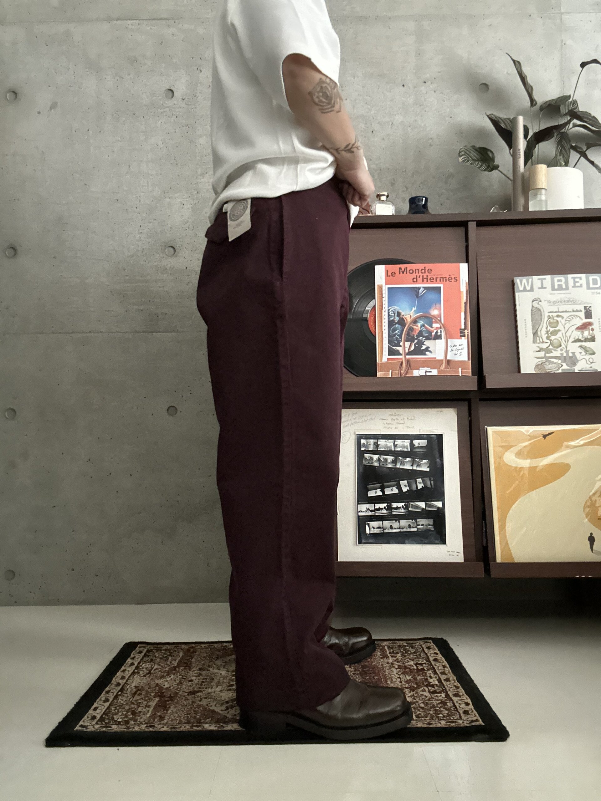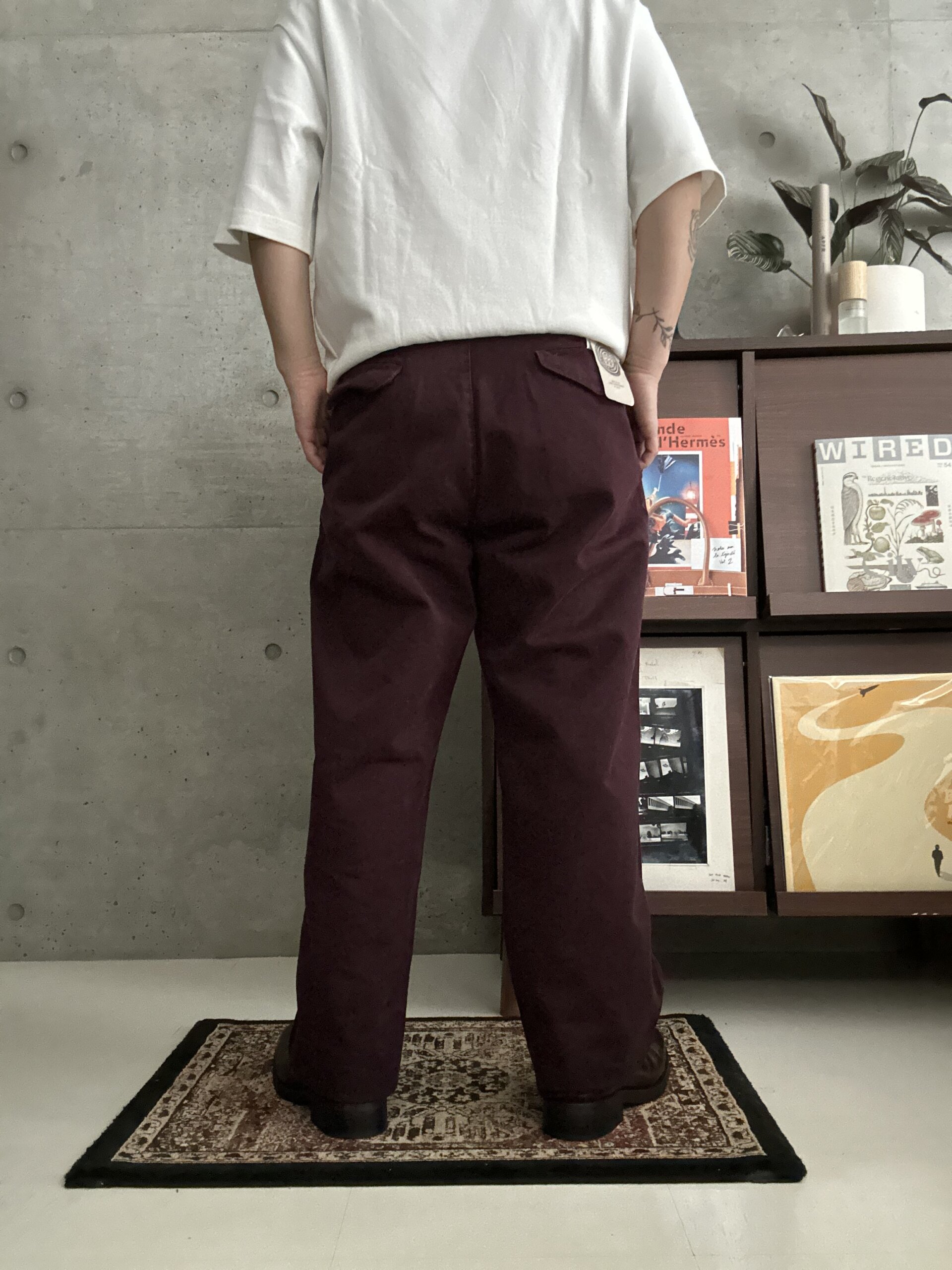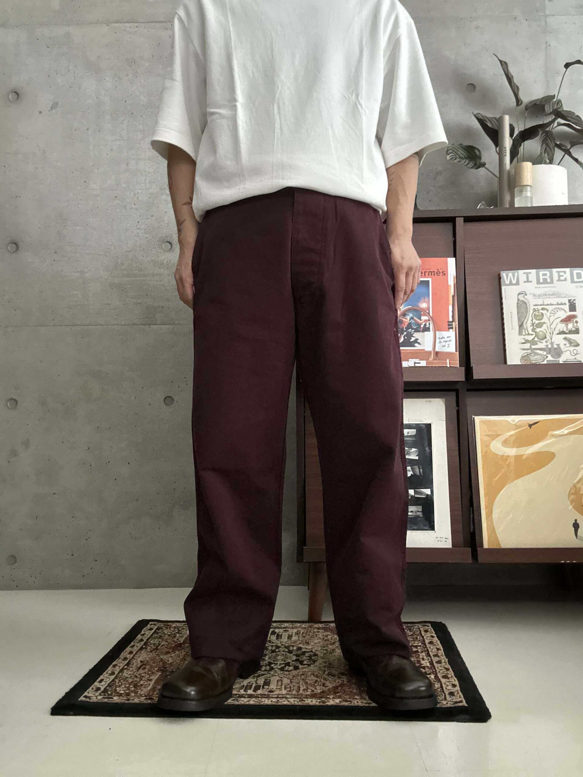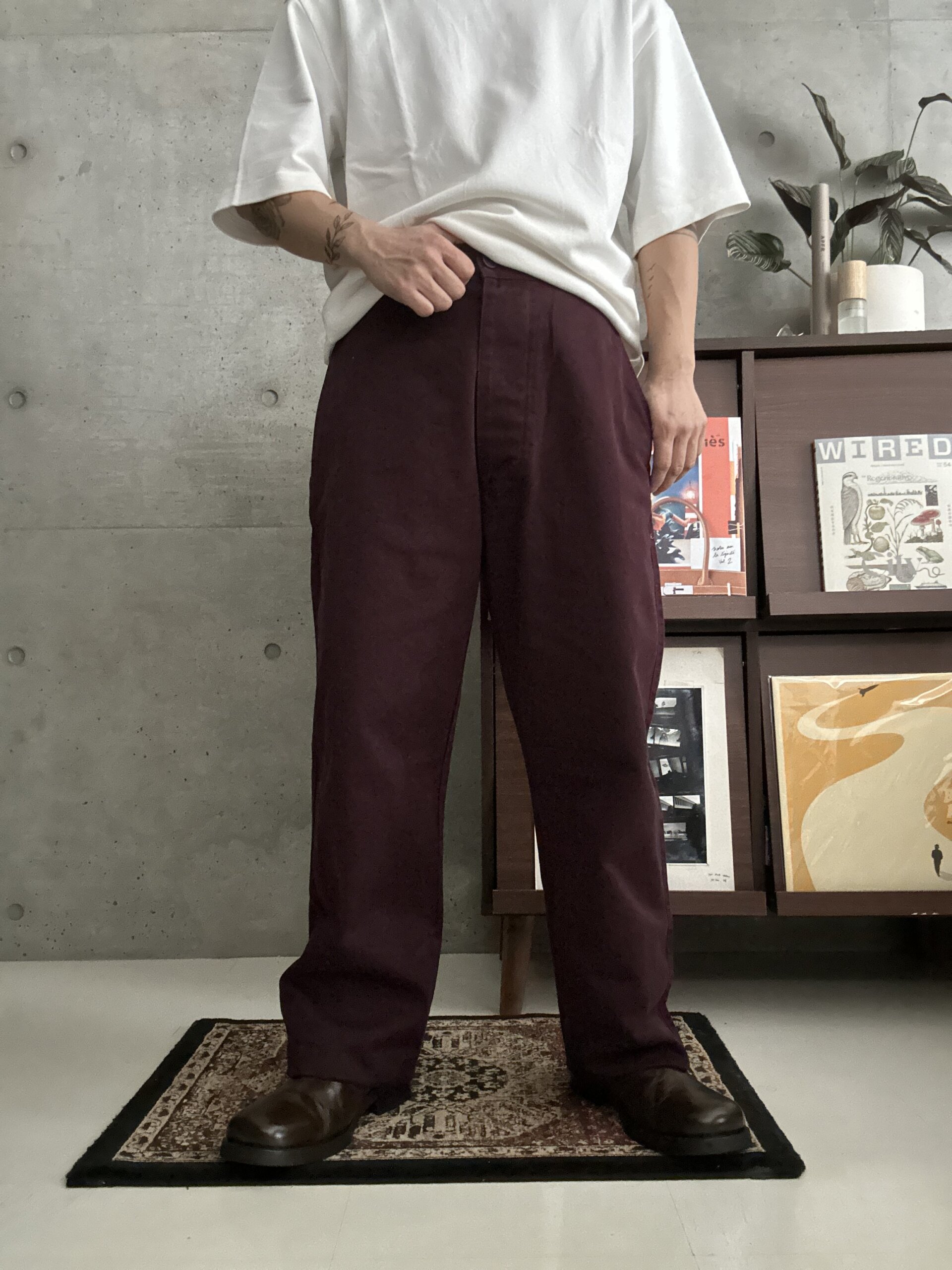 渋い色味のボルドーチノパンツ。