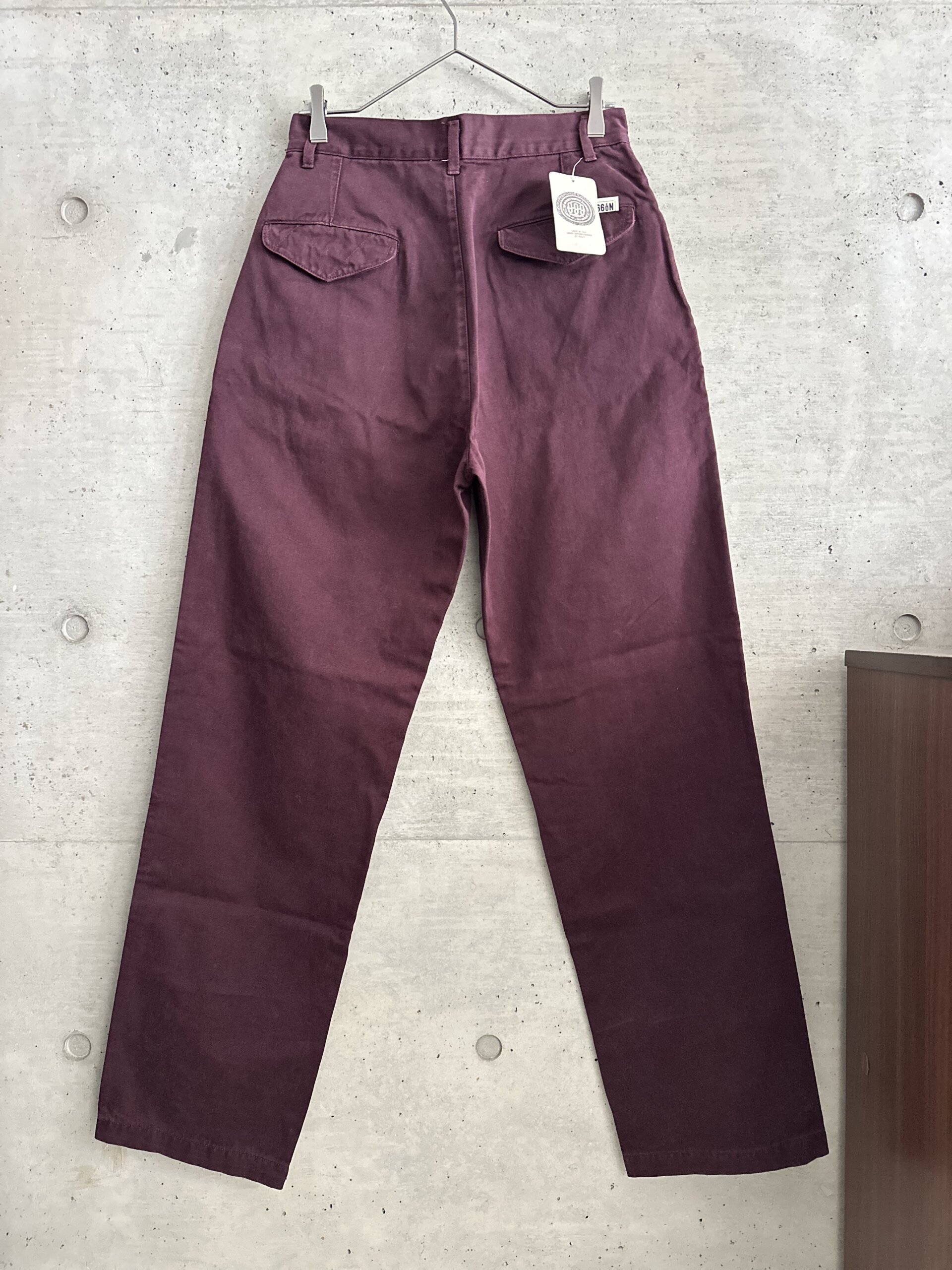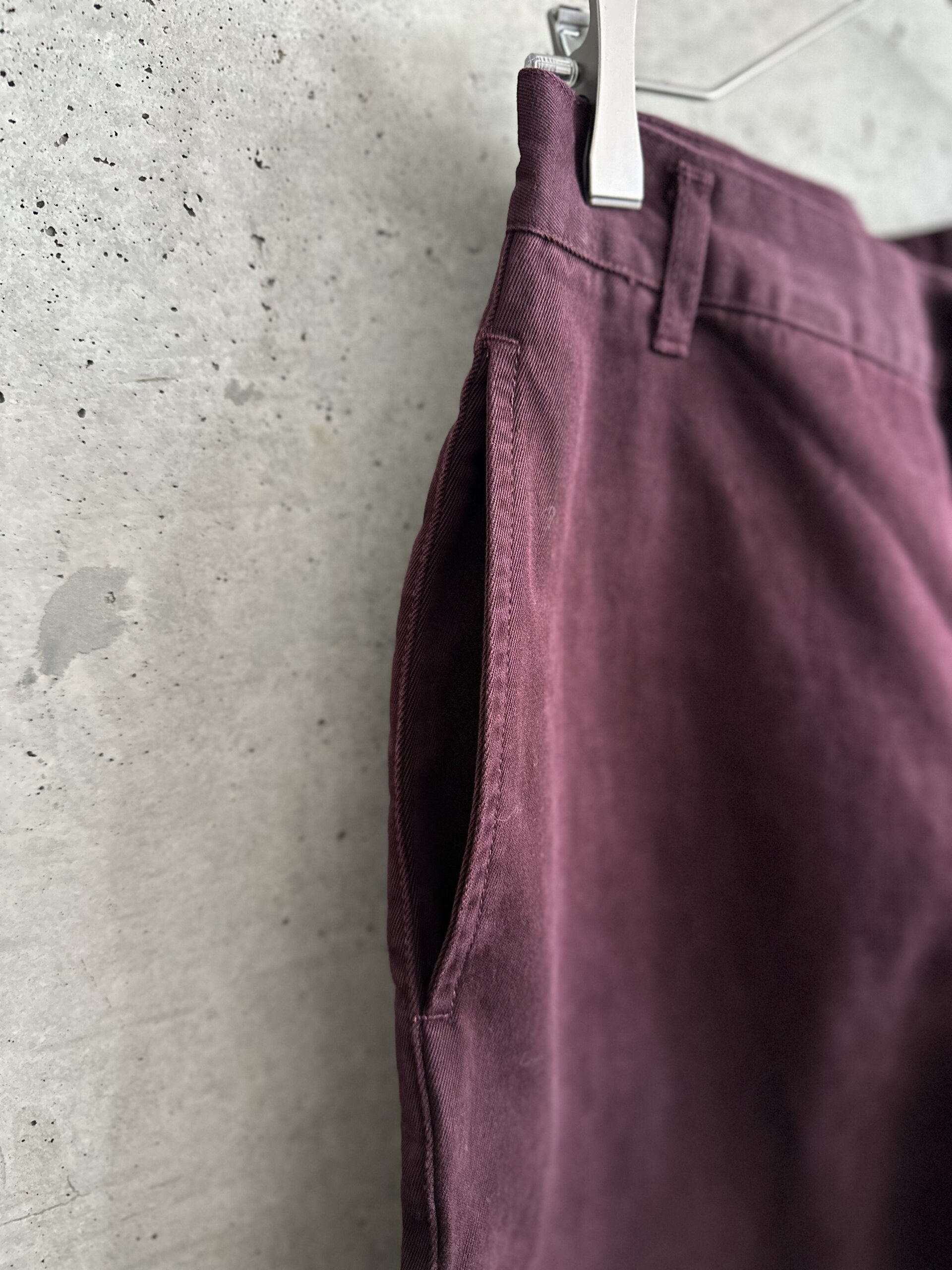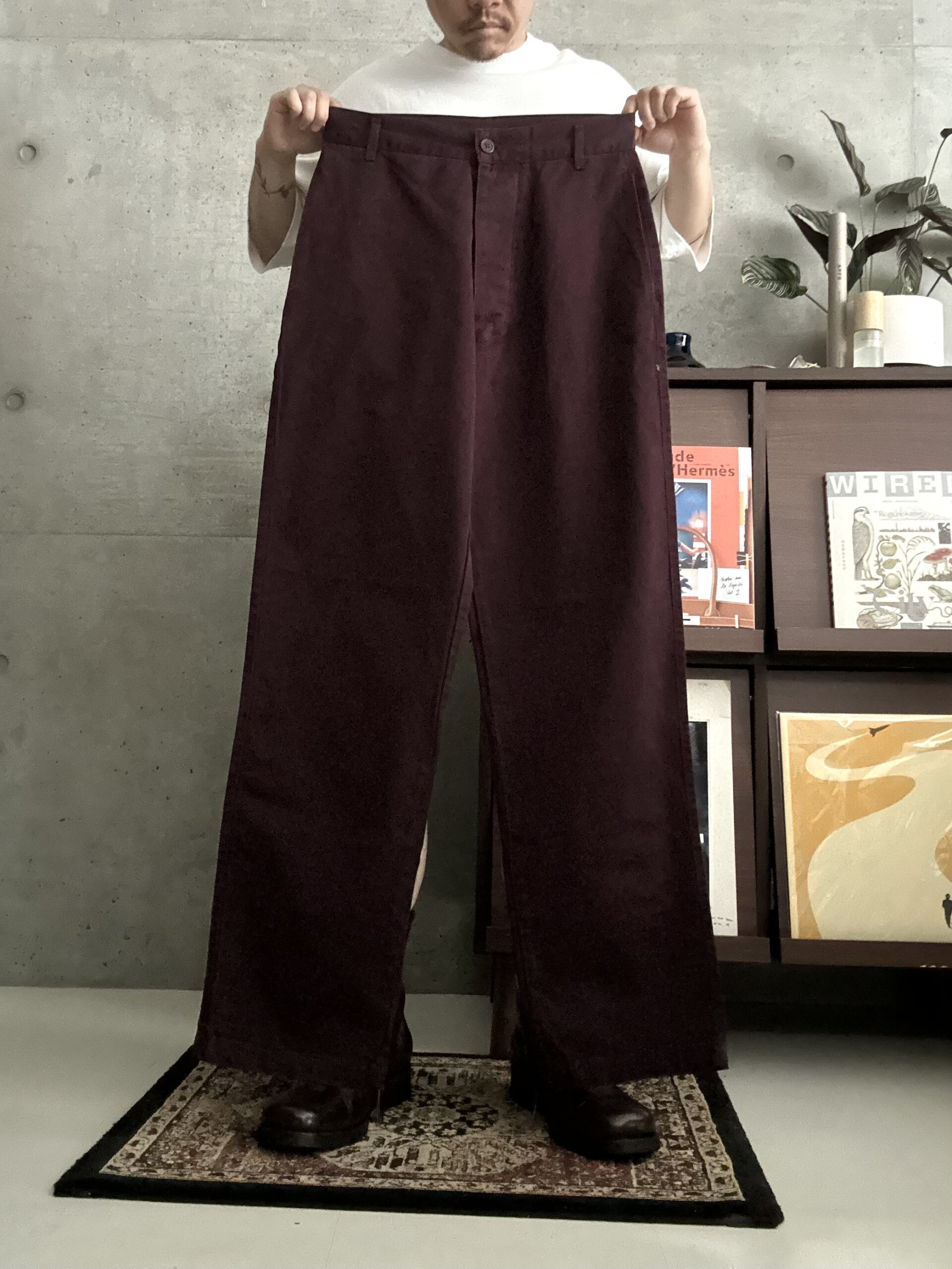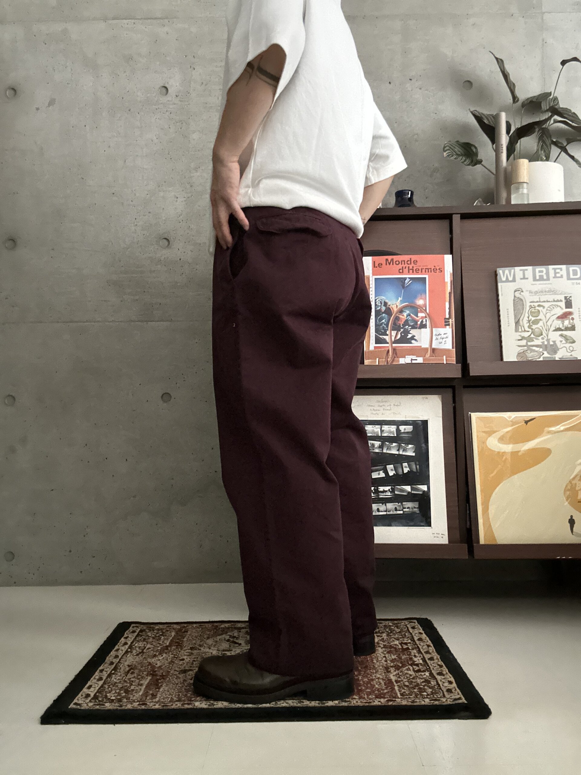渋い色味のボルドーチノパンツ。