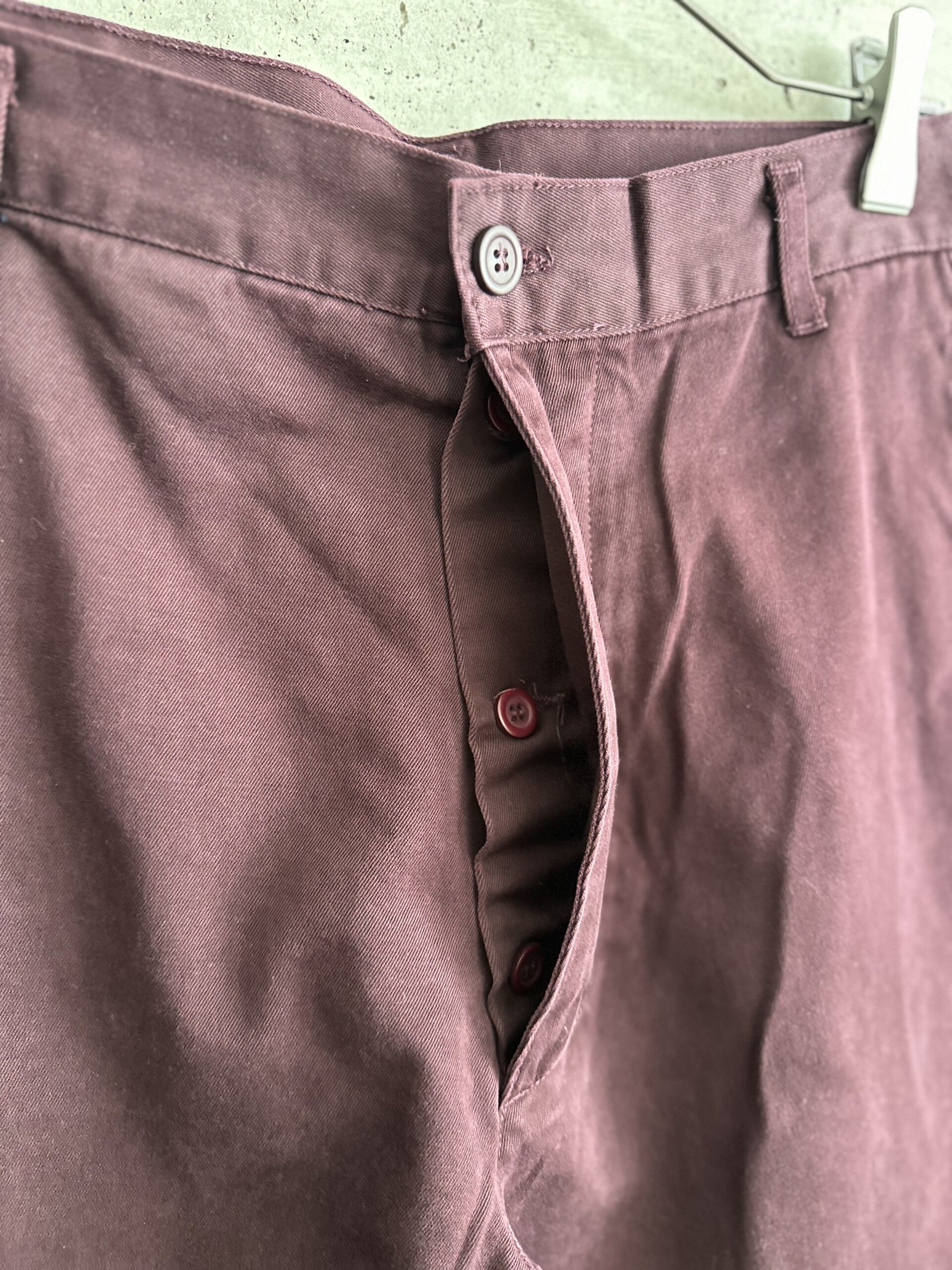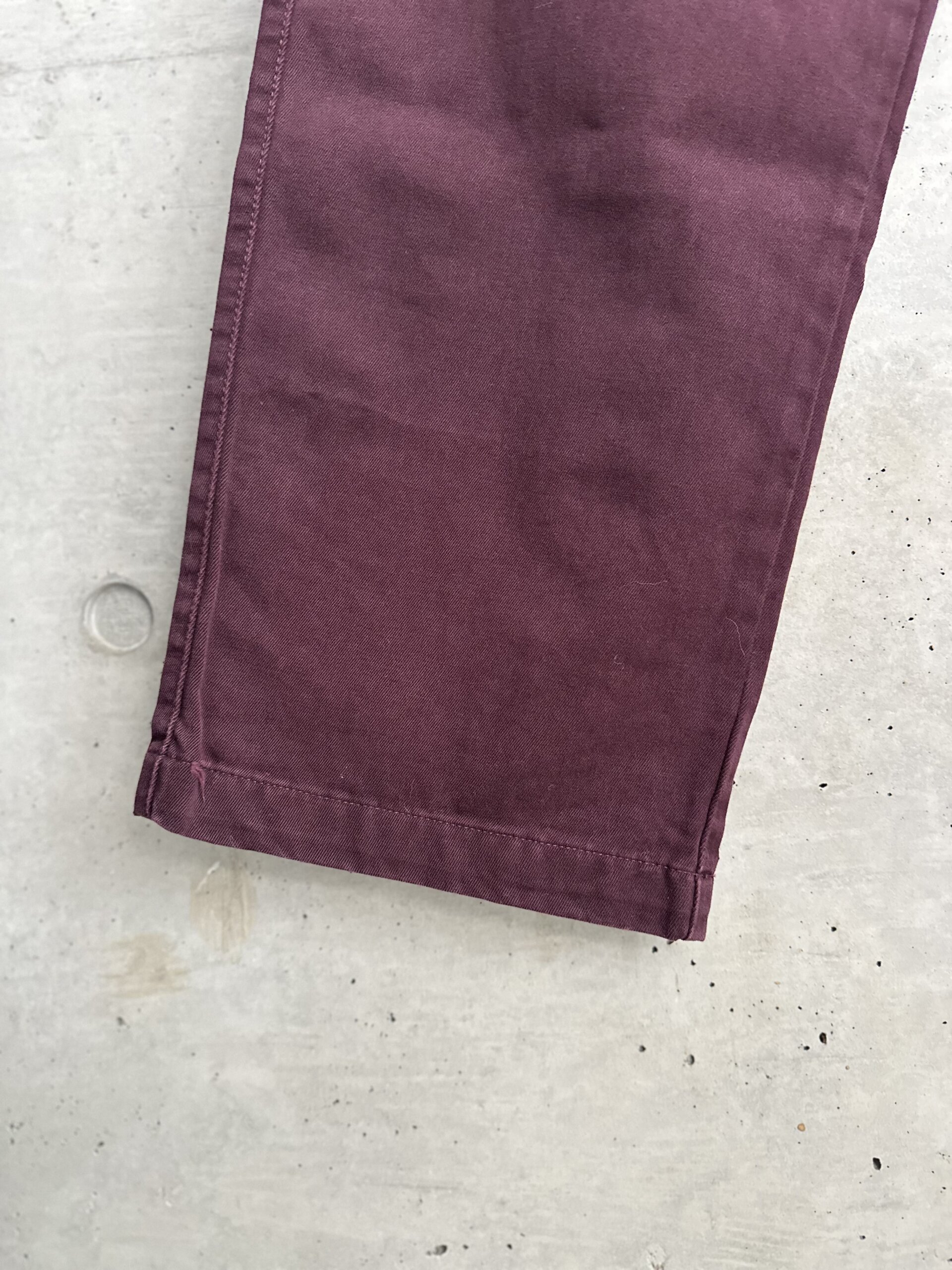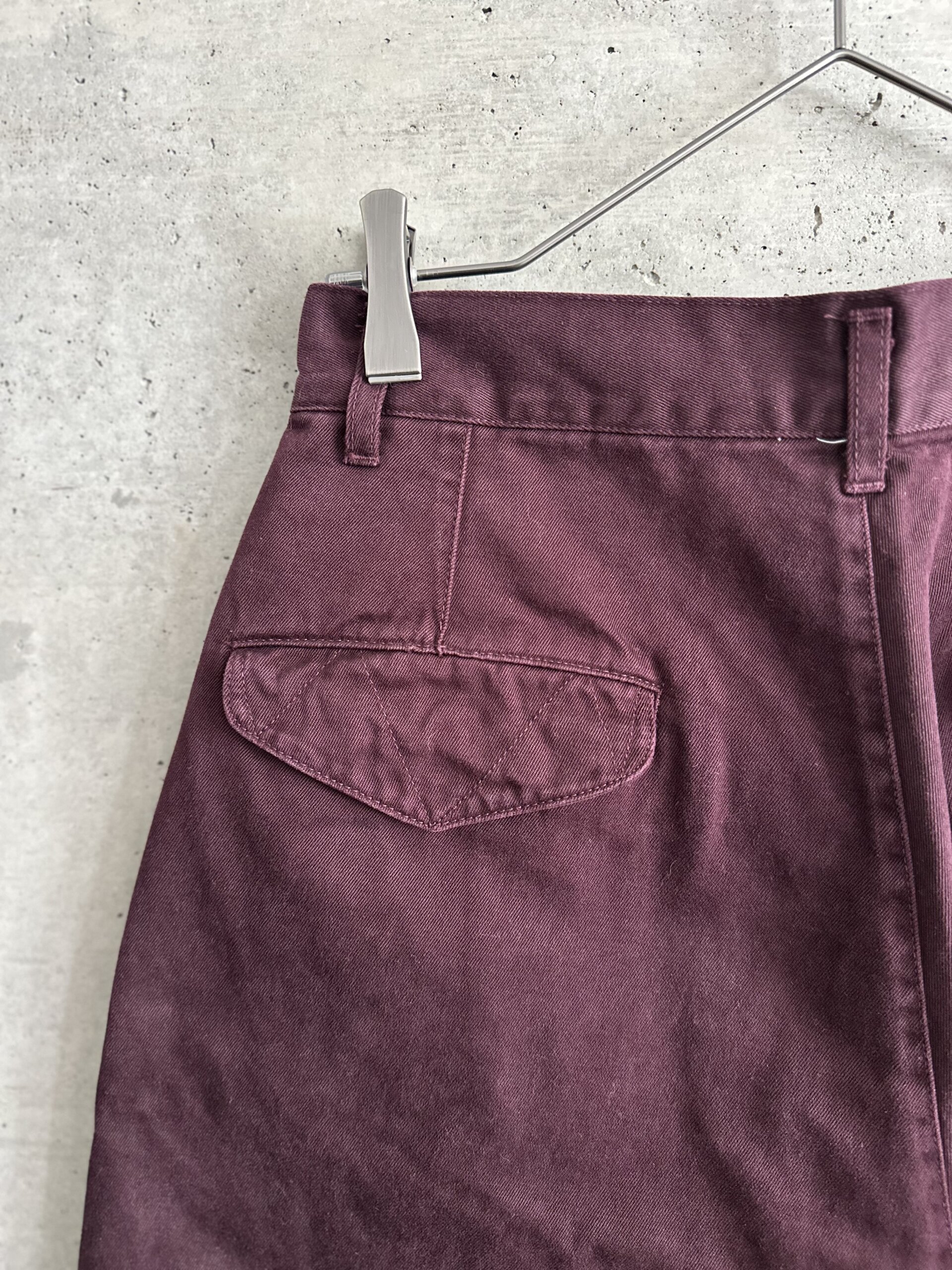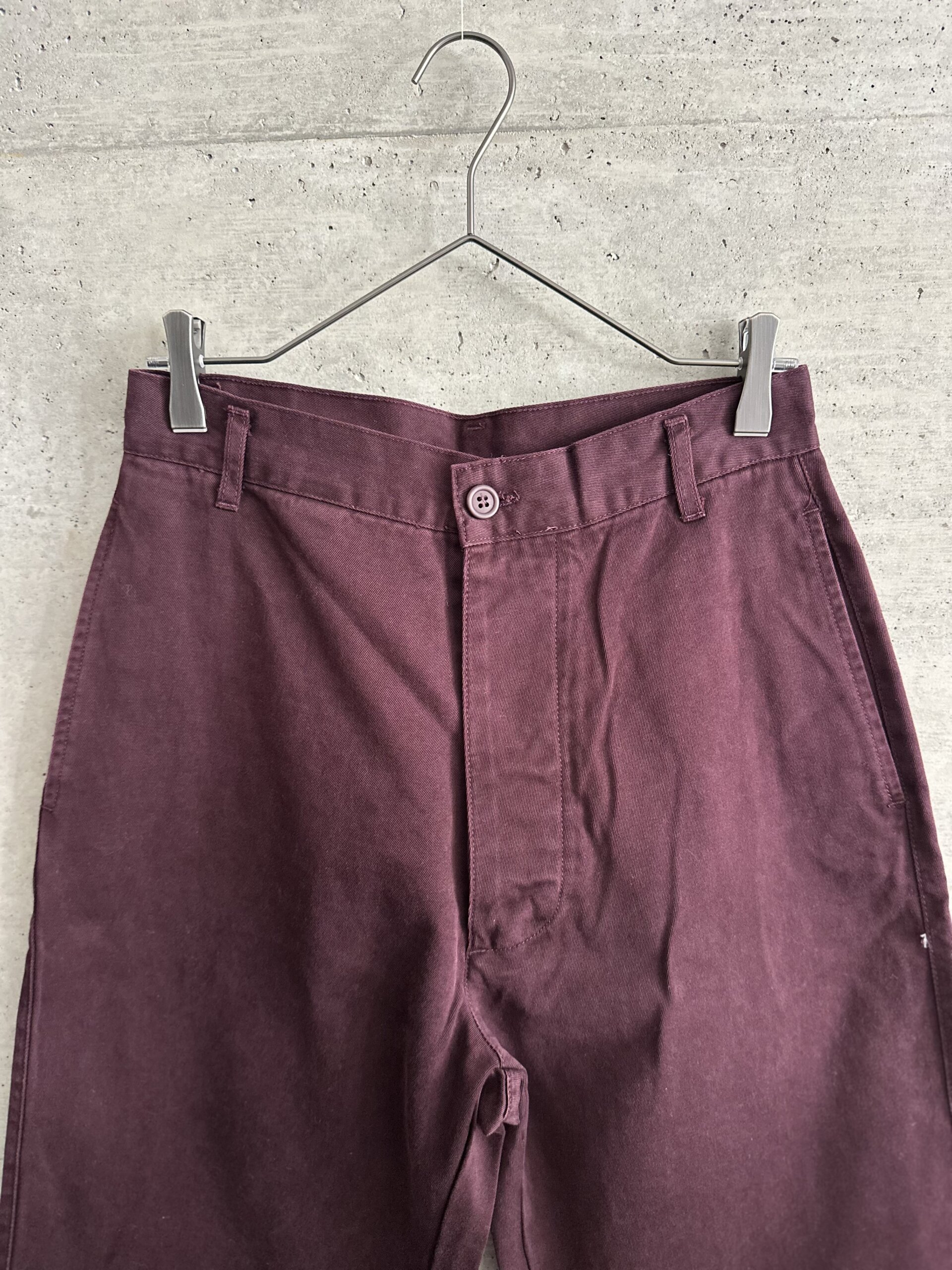 渋い色味のボルドーチノパンツ。