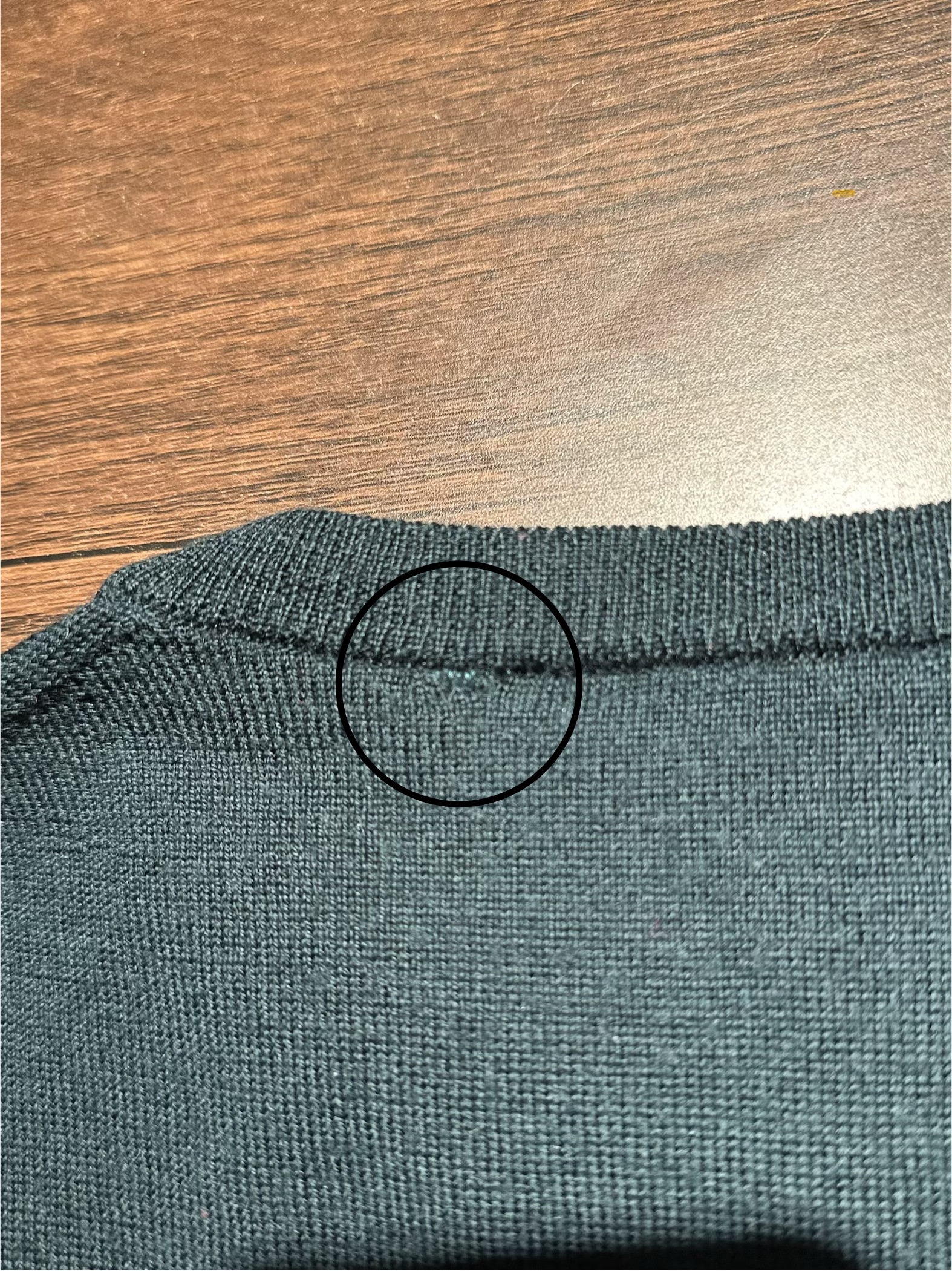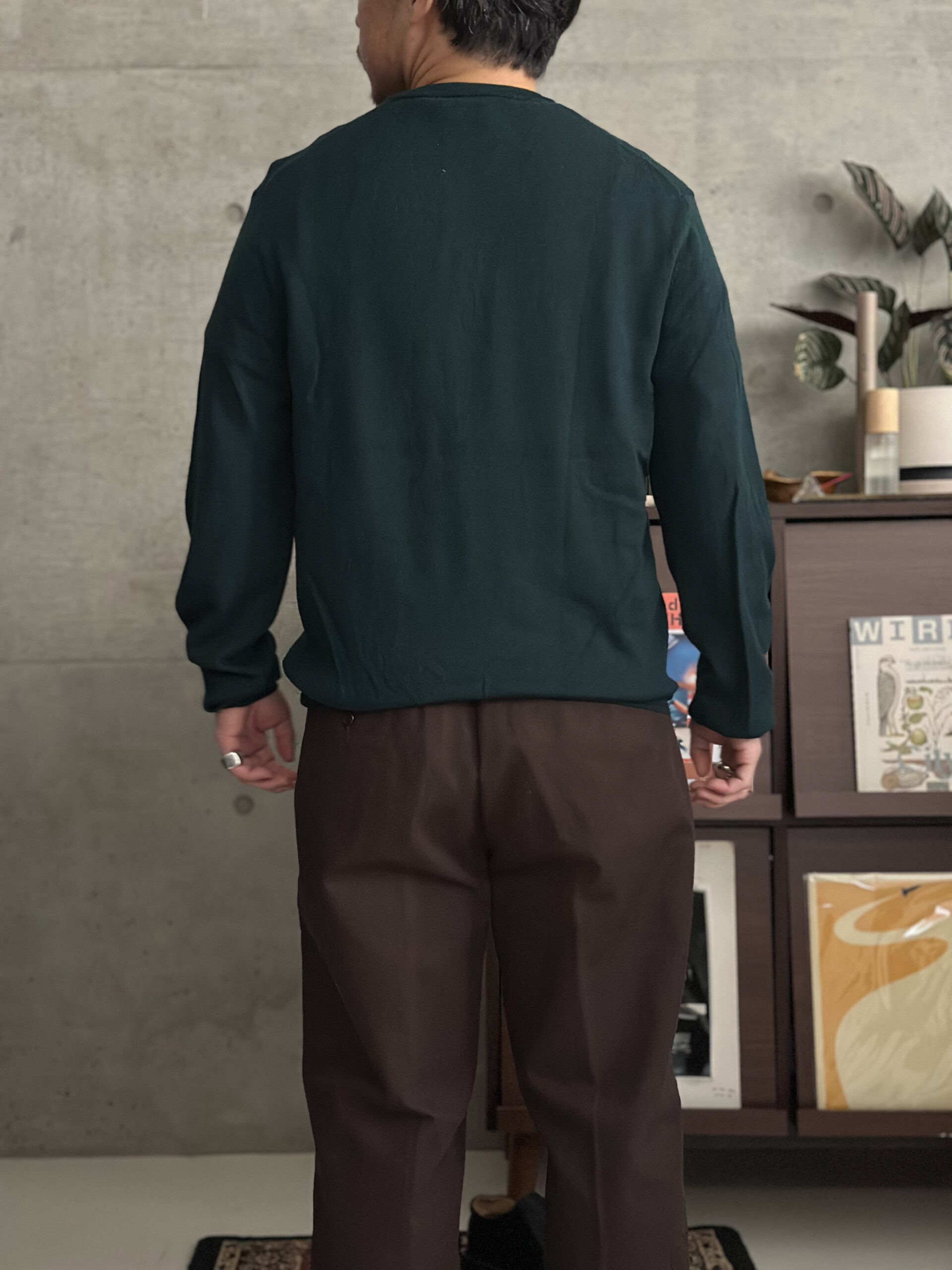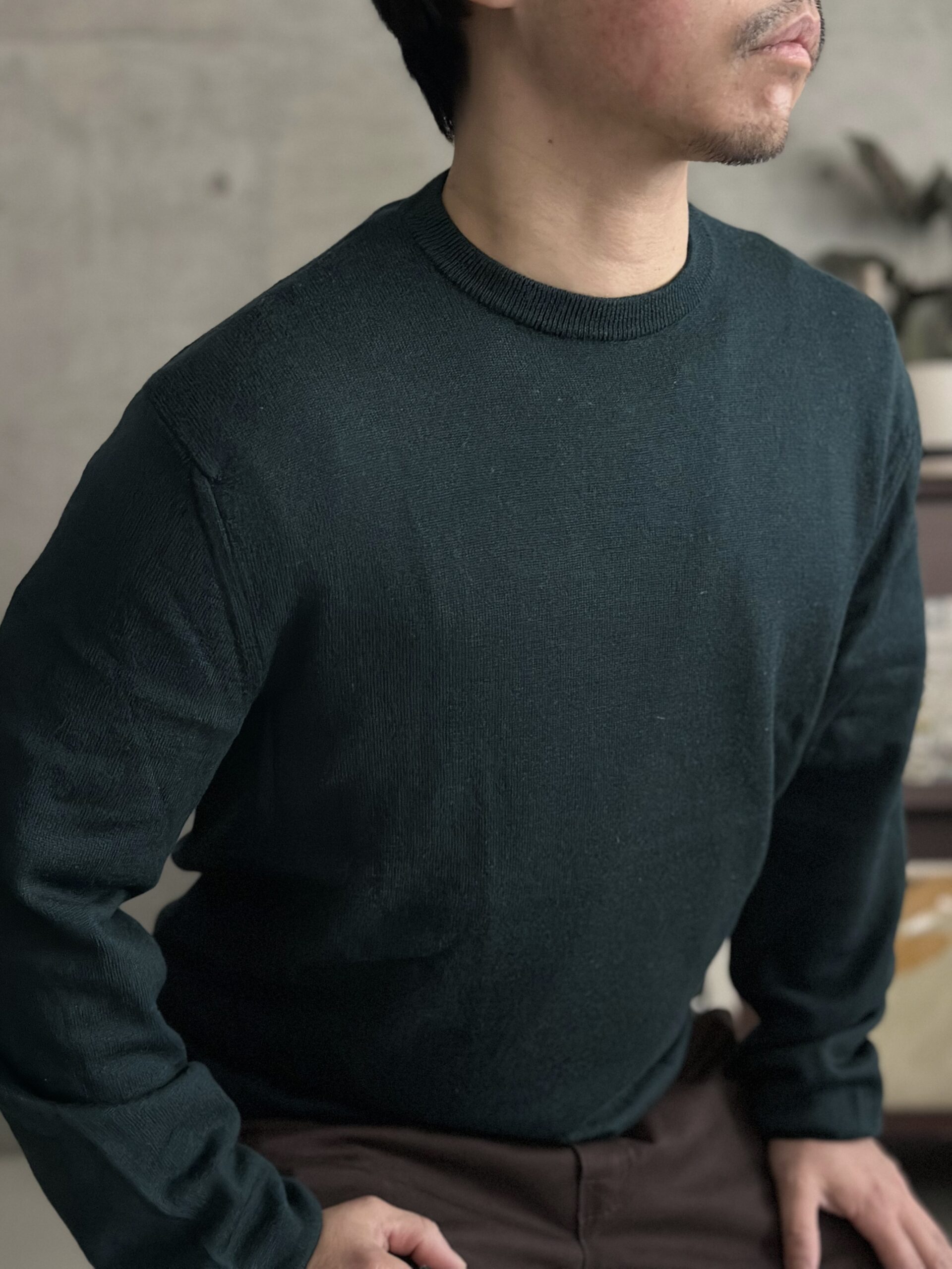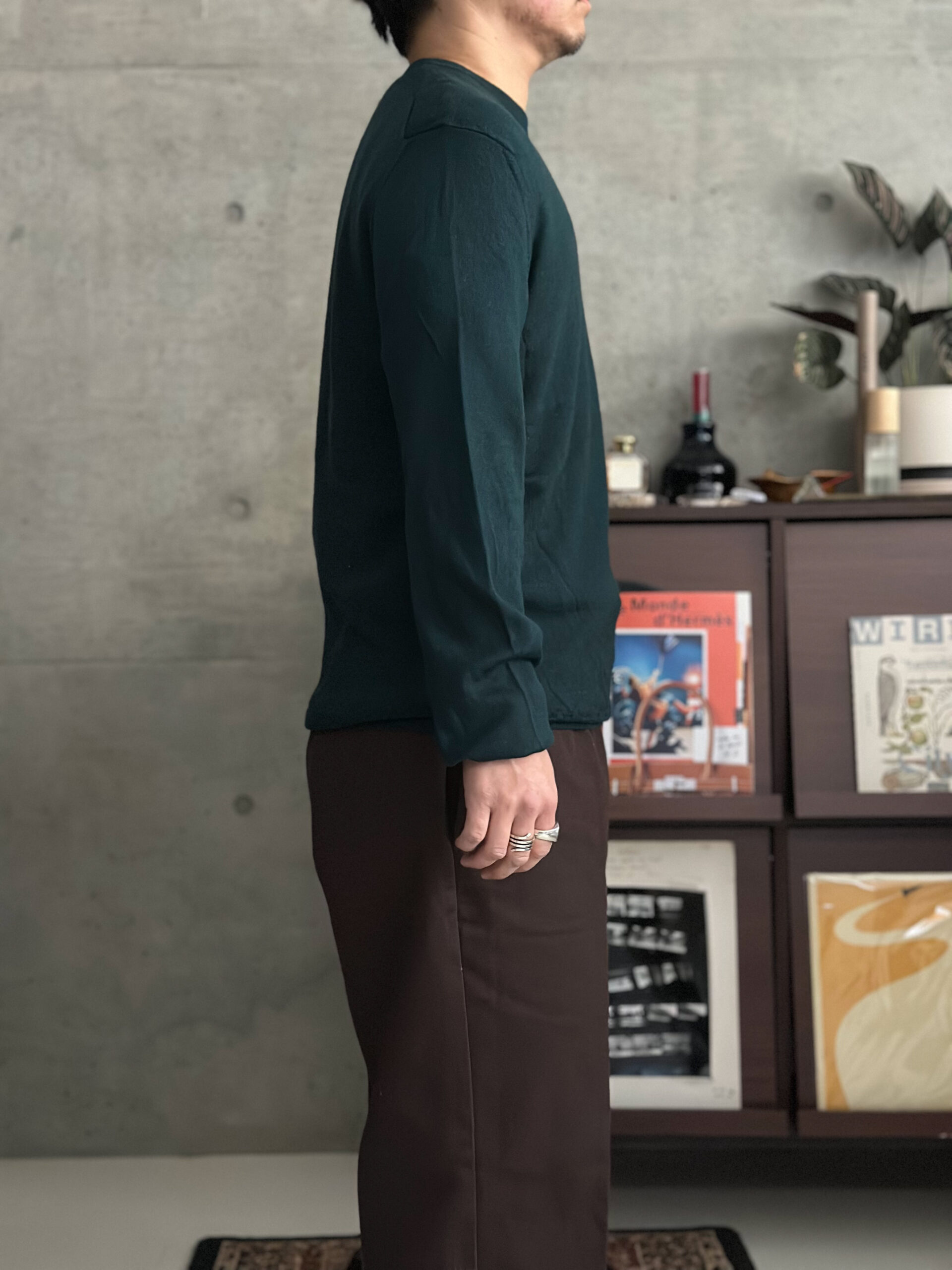 深みのあるグリーンが特徴的なクルーネックニット。