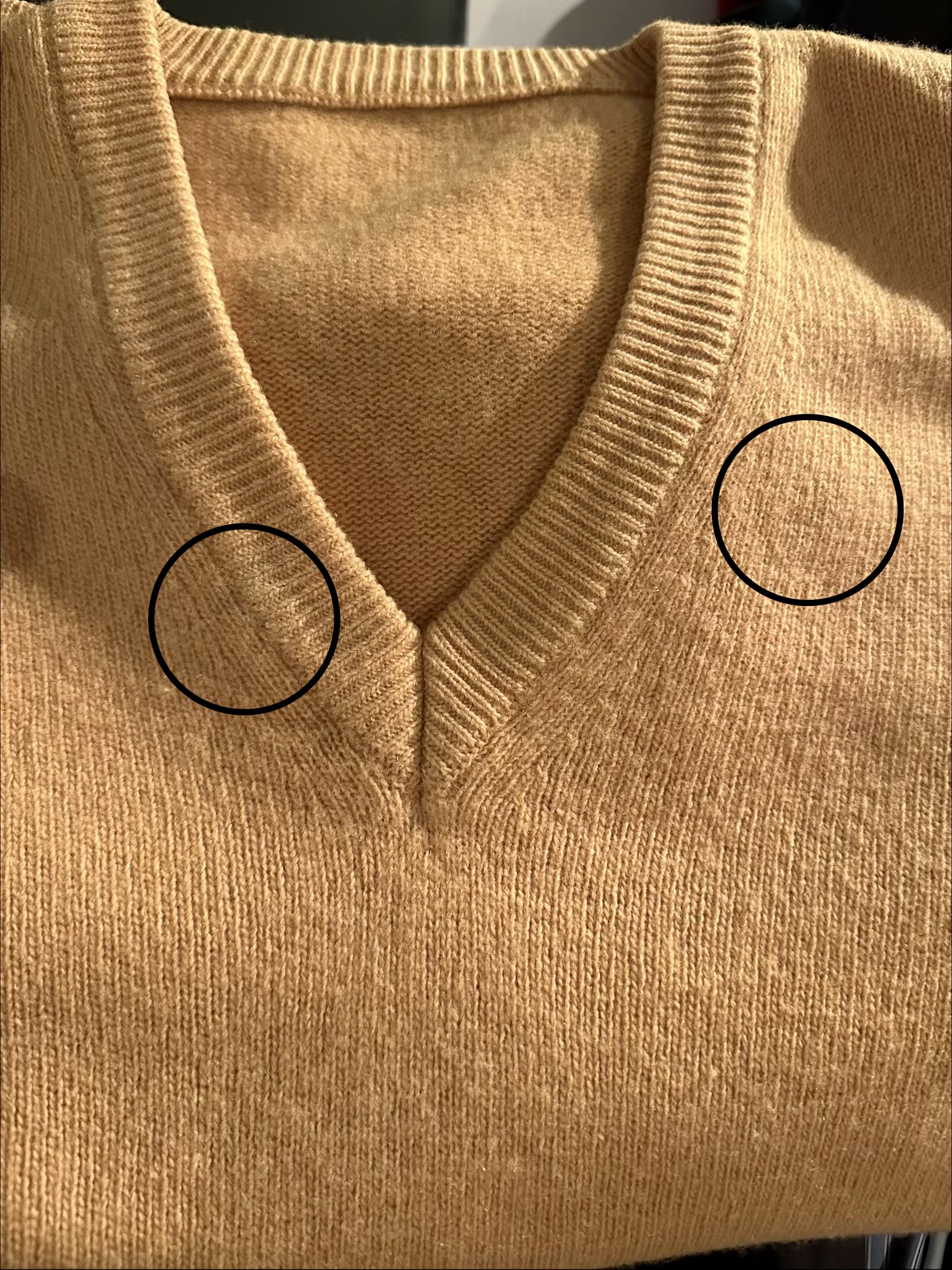 ※Vネック付近部分に薄汚れあり(写真参照)、後ろ裾付近に若干小穴あり。